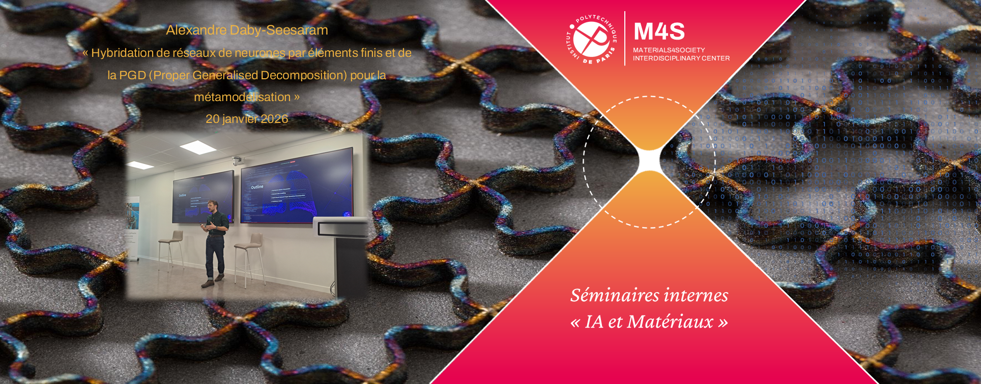 Le 20 janvier 2026, Alexandre Daby-Seesaram, enseignant-chercheur au Laboratoire de Mécanique et de ses Interfaces (ENSTA) a animé la deuxième édition des séminaires "IA et Matériaux" de M4S. Sa présentation s'intitulait "Hybridation de réseaux de neurones par éléments finis et de la PGD (Proper Generalised Decomposition) pour la métamodélisation" et portait sur des travaux de recherche en cours au laboratoire.