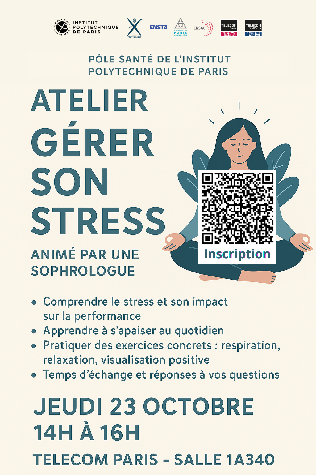 Pour vous aider à mieux le comprendre et à le gérer, le Pôle de Santé de l’Institut Polytechnique de Paris organise un atelier convivial et interactif animé par une sophrologue professionnelle.